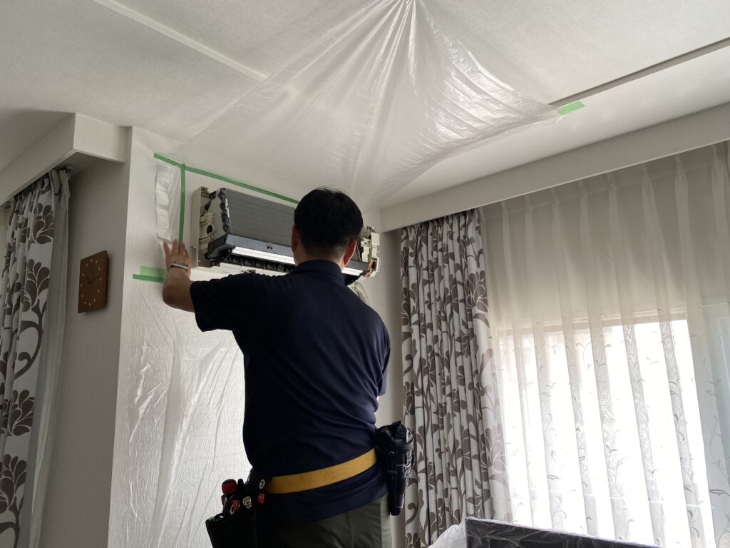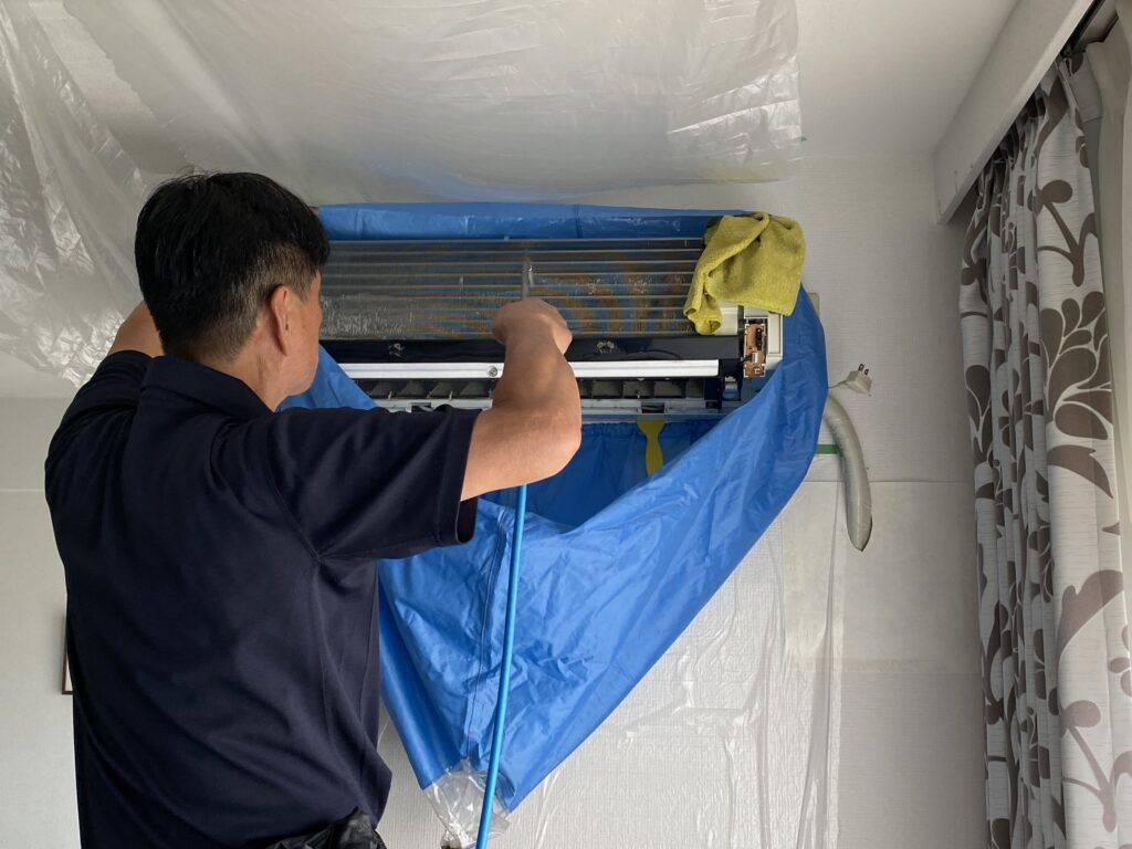 エアコンクリーニング作業を開始。作業終了後に仕上がりのご確認をスタッフと一緒にしていただきます。