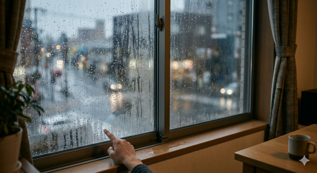 結露は、室内外の温度差が大きいときに発生します。そのため、寒い朝に窓が濡れている、暖房をつけた後に水滴が出る、料理や入浴の後に濡れが増えるといった特徴があります。雨が降っていない日でも発生するのが結露の大きな特徴です。